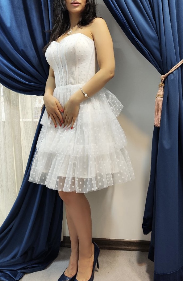پیراهن عروسکی با تور خالدار سپید، مناسب انواع مجالس. و همچنین مناسب عروس خانمها، لباس فرمالیته و عقدکنان.