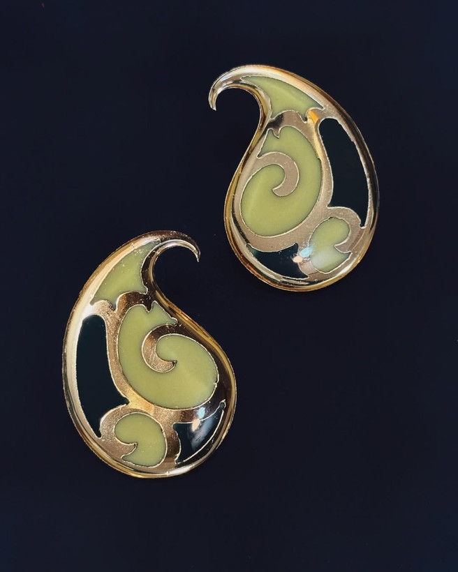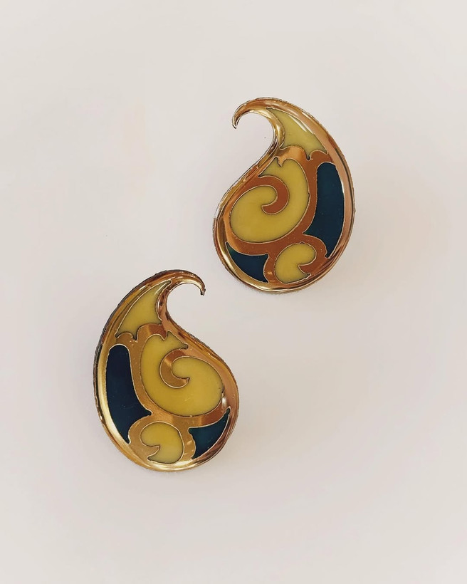 “گوشوارههایی که داستان را روایت میکنند!بته جقه یا سرو خمیده با رنگهای زرد و آبی، تجلی هنر کهن پارسی، استایل شما را باشکوهتر میکند. بها با احترام: