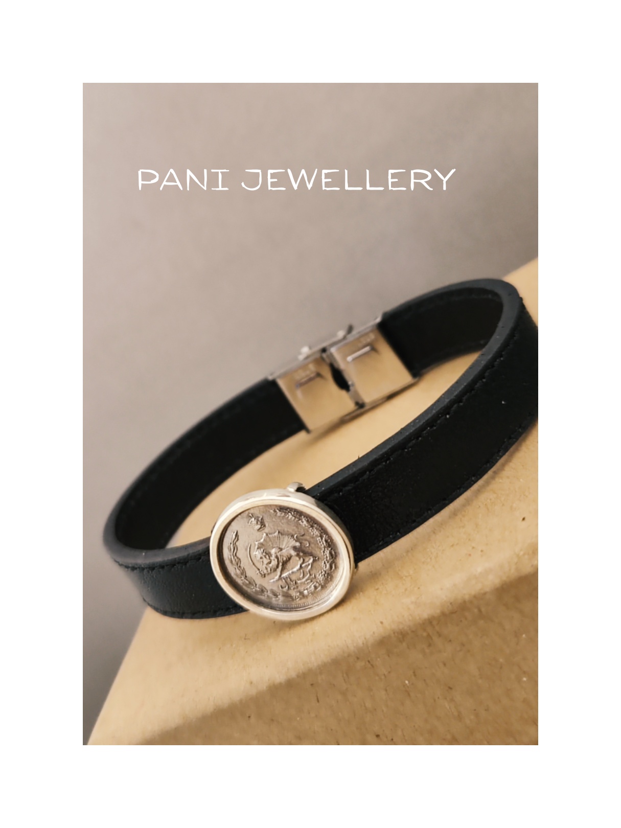 چرم طبیعی گاوی قفل استیل نقره عیار ۹۵۰ به وزن حدود ۲ گرم سکه یک ریالی قدیمی قد دستبند ۲۱ سانتیمتر( قابلیت کوتاهتر شدن دارد)
